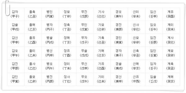 4. 그중에서 왼쪽에서 2번째, 오른쪽에서 3번째 칸이 일주에 대한 한자이다.